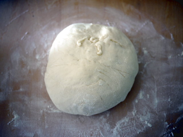 強力粉、塩、バター、砂糖、イースト、温めた水+牛乳をこね、一次発酵させた生地。