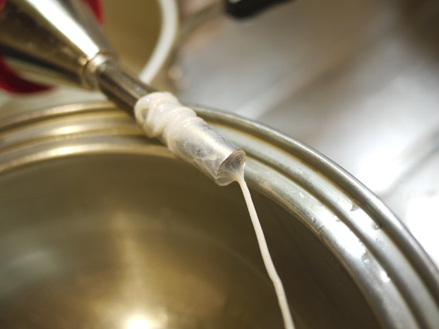 水でもどして塩抜きした羊腸のケーシングをソーセージメーカーに装着して、