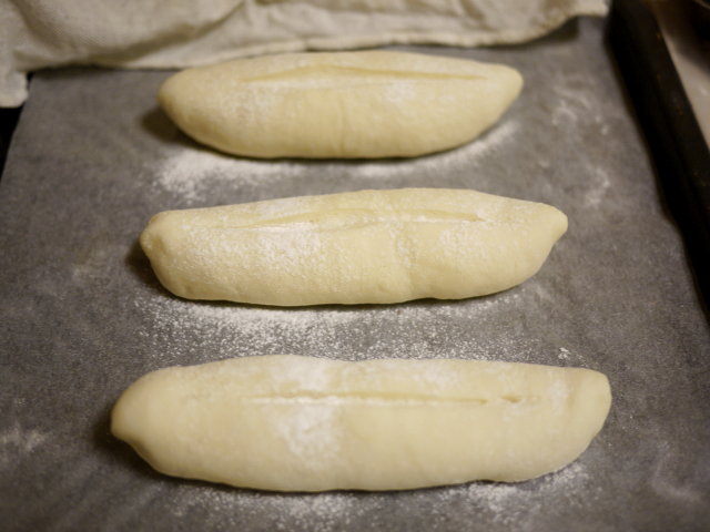 コッペパン風に細長く成型して、包丁で中央に切れ目を入れ、強力粉を振って15分ほど二次発酵させる。