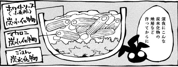 ジュンちゃんの家で、テスト前の徹夜勉強に勤しむブン。お腹の空いたジュンに夜食をリクエストされ、意気揚々とキッチンに立ちますが、ふだん料理しないジュンのキッチンは「単身赴任のお父さん並み」のプアな環境。そこで近くの100均コンビニで調理器具と食材を仕入れて作ったのが、この料理。